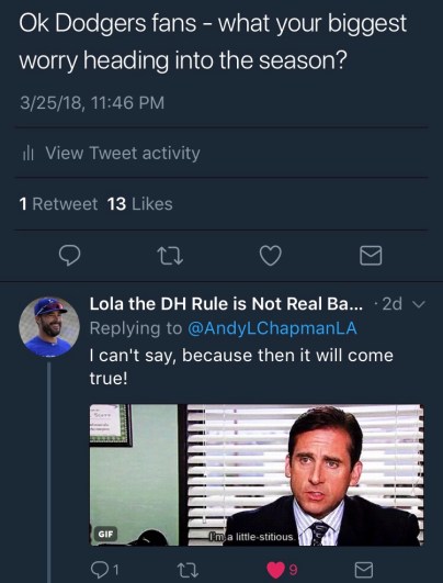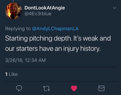 INJURIES—Losing a player or two to injury can befall any team at any time. It’s just the nature of the game. But Dodger fans are heading into the season worrying about three very specific, very good, Very Important players. Justin Turner is already on the DL after having been hit by a pitch on his left wrist in a Cactus League game. Clayton Kershaw has dealt with back issues each of the last few seasons. And while all evidence and statements from the team seem say that Corey Seager’s elbow is perfectly fine, that worry can’t help but creep into the back of Dodger fans’ minds. The Dodgers, with their incredible farm system, can weather one of these, maybe two. They’ve already done so with Kersh being out for stretches the last couple seasons, and Seager being out of the NLCS. All three at once? Well, they most likely could handle that, too. But let’s not find out.