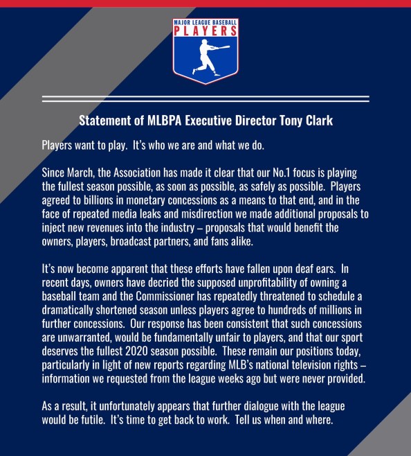 From the letter from the MLBPA: “If it is your intention to unilaterally impose a season, we again request that you inform us and our members of how many games you intend to play and when and where players should report. It is unfair to leave players and fans hanging at this point.”