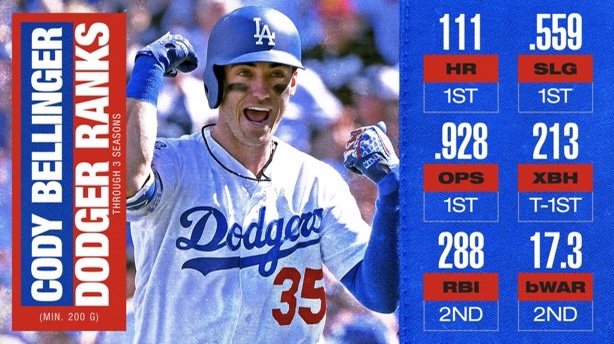 Cody has the most home runs before age 25 as a Dodger, with 111. The next closest was Adrian Beltre, who had 100. Beltre has the most before turning 26 with 147, a mark that Bellinger should also be able to surpass.