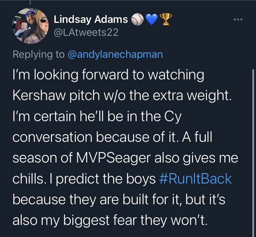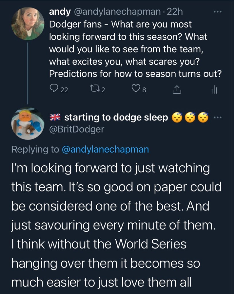 I asked some Dodger fans on Twitter what they were most looking forward to this season, what worries do they have, and if they’d like to make any predictions.