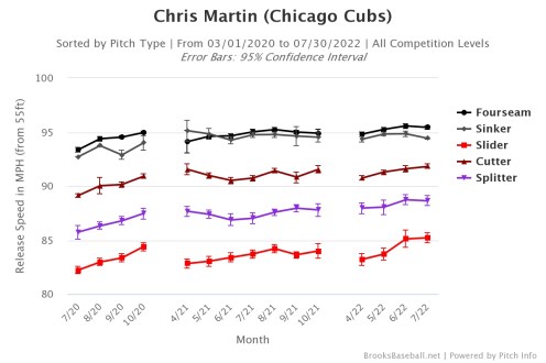According to Brooks Baseball, Martin primarily throws a four-seam, a cutter and an occasional slider. While his heater sat as high as 96-97 MPH in his heyday, he’s mostly been sitting in the 94-95 MPH range this year.