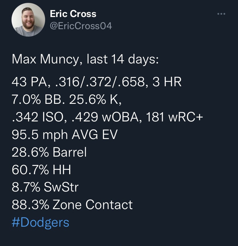 Muncy had a completely terrible, horrible, no good, very bad first half. One could most likely tie that to his not being completely back from his shoulder injury from last season. But whatever it is, Max has seemingly started to find his former strength and production.