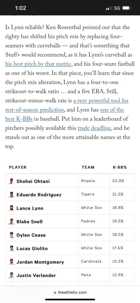 One thing Lynn does possess is the ability to go late into games, something that pitchers in the current Dodgers rotation seem to lack. Also, Eno Sarris had this to say about Lynn in The Athletic recently –