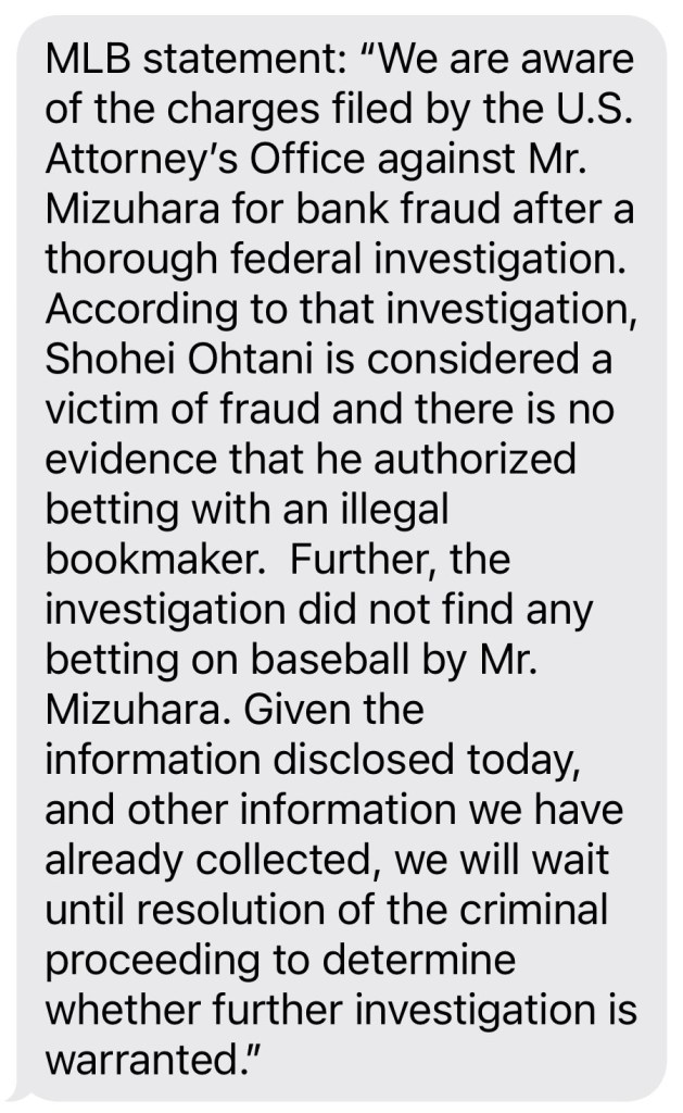 Federal investigators have stated that at this time, Ohtani is a victim and is not being charged with anything. Ohtani willingly worked with investigators and turned over personal devices.